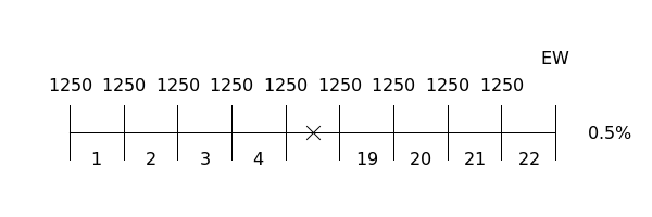 In de tijdlijn zien we dat hier sprake is van een eindwaarde van een prenumerando rente bestaande uit #22# jaarlijkse termijnen van ieder #\euro \, 1250# tegen een interest van #0.5\%# per jaar.