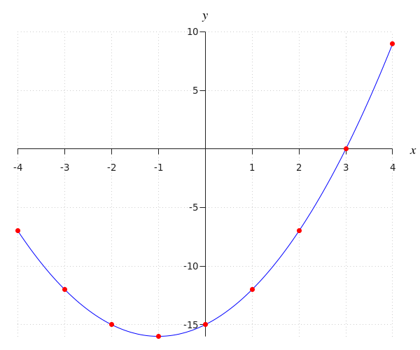 #\boldsymbol{y}# | #-7# | #-12# | #-15# | #-16# | #-15# | #-12# | #-7# | #0# | #9# |