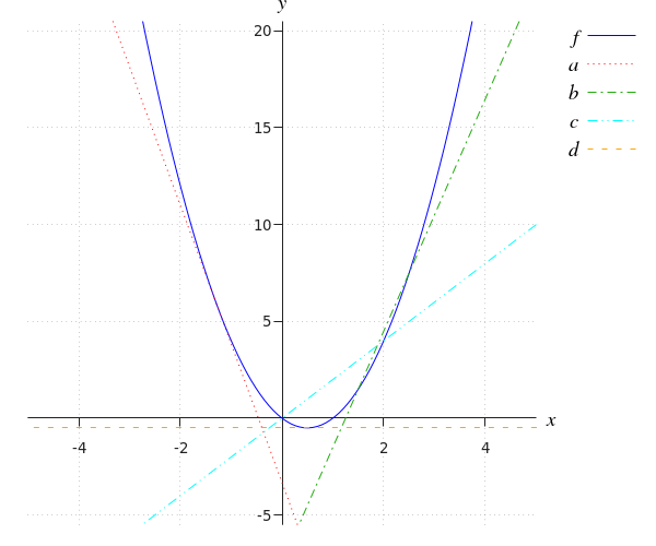 If we take a smaller #\green{h}#, we see that line #\orange{k}# around point #\blue{a}# is increasingly similar to the graph.