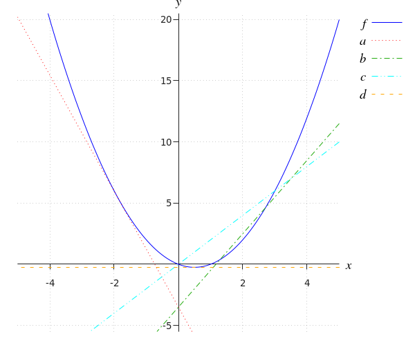 If we take a smaller #\green{h}#, we see that line #\orange{k}# around point #\blue{a}# is increasingly similar to the graph.