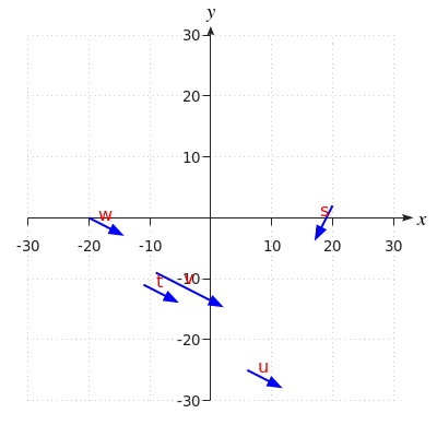 Welke van de vectoren in het hieronder getekende vlak representeren de vector #\rv{5.3,-2.7}#?