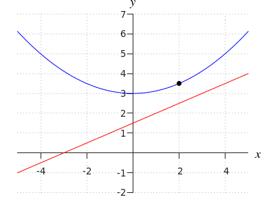Hieronder zie je vier afbeeldingen van de grafiek #f(x)=\frac{1}{4} x^2+4# (blauw getekend), een lijn (rood getekend), en het punt #\rv{2,5}#. In welke afbeelding is de lijn de raaklijn aan #f# door het punt #\rv{2,5}#?