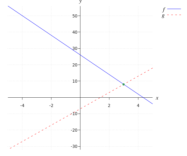 We can see that the #x#-coordinate of the intersection point is equal to #3#. The #y#-coordinate of the intersection point is equal to #8#.