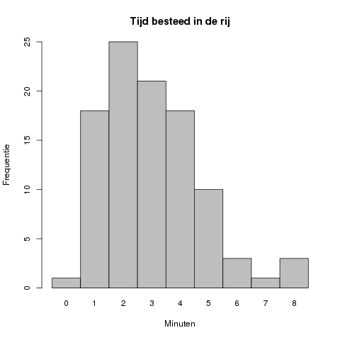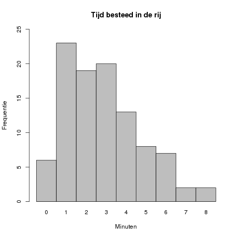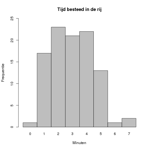 In dit geval ligt de piek van de grafiek bij #2# minuten, met een geobserveerde frequentie van #25#.