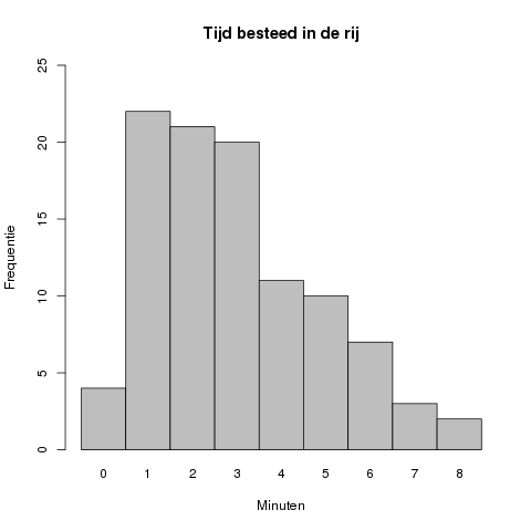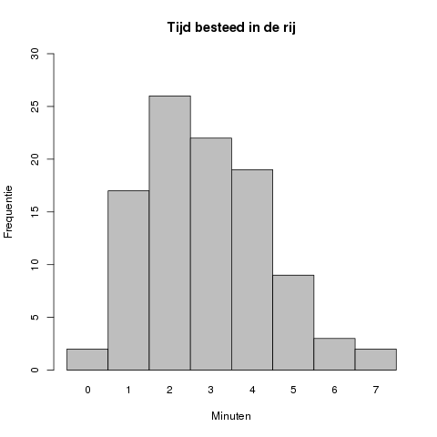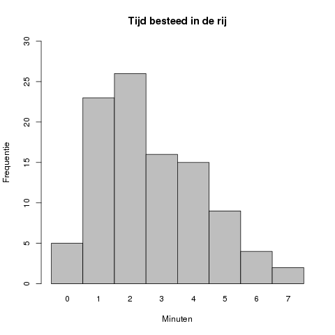 In dit geval ligt de piek van de grafiek bij #2# minuten, met een geobserveerde frequentie van #26#.