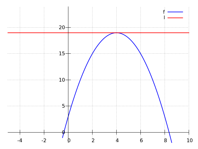 De formule van de raaklijn ziet er dan uit als: #l(x)=0 \cdot x +b#. Je hoeft nu alleen nog #b# te berekenen. Dit gaat eenvoudig. De raaklijn gaat door #\rv{4,19}#. Dus #b=19-0 \cdot 4 = 19#. Het functievoorschrift voor de raaklijn is dus #l(x)=19#.