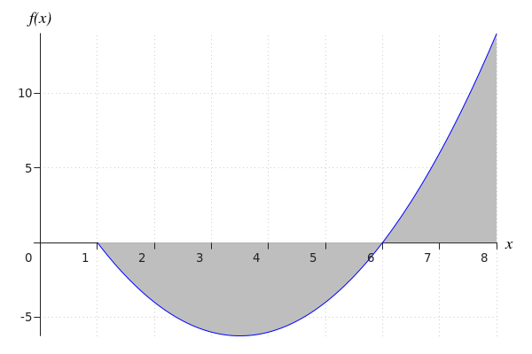 Étape 3 | L'aire de la surface est égale à \[-\int_{1}^{6} f(x) \, \dd x+ \int_{6}^{8}f(x) \, \dd x\] |