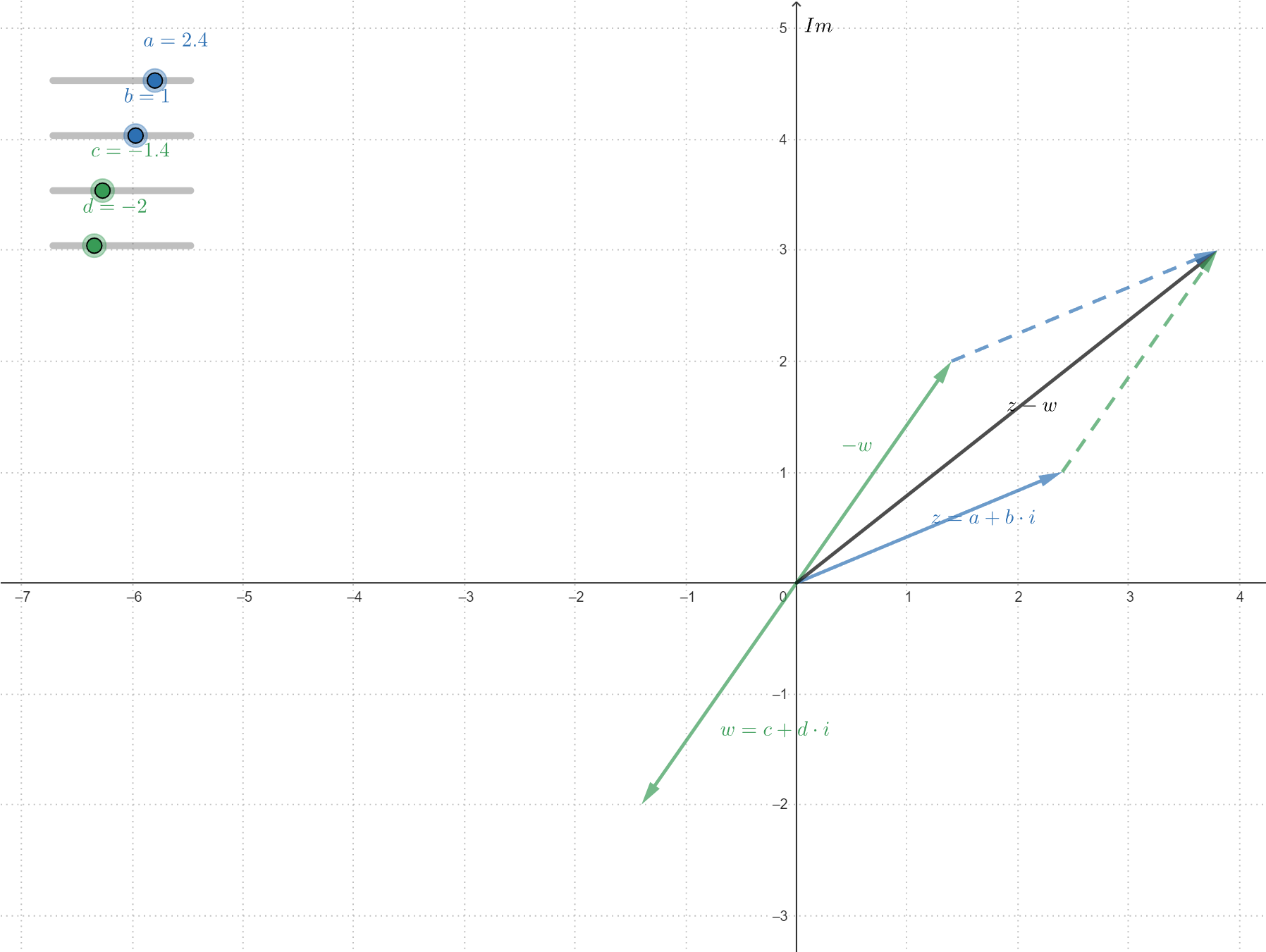 \[\begin{array}{rcl}\blue{z} - \green{w} &=& \left(\blue{a+b\cdot \complexi}\right) - \left( \green{c + d\cdot \complexi}\right)\\ &=& \left(\blue{a} - \green{c}\right) + \left(\blue{b} - \green{d}\right)\cdot \complexi\end{array}\]