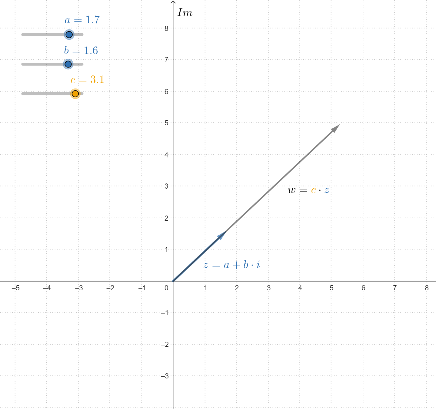 \orange{c}\cdot \blue{z} &=& \orange{c}\cdot \left(\blue{a+b\cdot \complexi}\right) \\