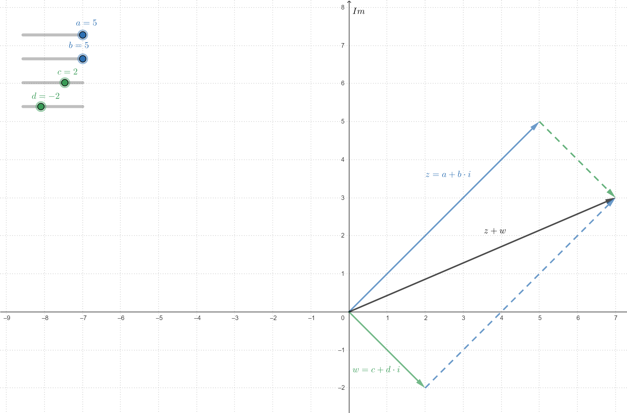 \[\begin{array}{rcl}\blue{z} + \green{w} &=& \left(\blue{a+b\cdot \complexi}\right) + \left( \green{c + d\cdot \complexi}\right)\\ &=& \left(\blue{a} + \green{c}\right) + \left(\blue{b} + \green{d}\right)\cdot \complexi \end{array}\]