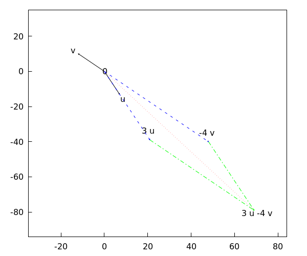 The figure below shows the vectors #\vec{u}# and #\vec{v}# drawn in black, the vectors #3\cdot \vec{u}# and #-4\cdot\vec{v}# in blue dashed lines, and the vector #3\cdot\vec{u}-4\cdot\vec{v}# in a red dotted line.